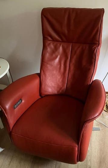 Rood leren seniorenstoel. Bedieningspaneel rechts. Met sta-op functie.alle functies doen het nog. De stoel heeft een draaiende poot. Leuningen zijn ongeveer 14 cm breed hoge rugleuning gemeten vanaf z