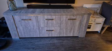 Complete woonkamerset van pronto wonen, gratis af te halen! De set bestaat uit een eettafel, hoge kast, dressoir en salontafel. Er zijn wel kleine gebruikerssporen aanwezig. Afmetingen in cm (lxd/bxh)