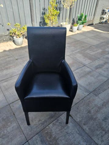 Comfortabele zwarte eetkamerstoel met armleuningen, bekleed met leer. De stoel is in goede staat en perfect voor aan de eettafel of als extra zitplaats. De stoel heeft een tijdloos design en past in d