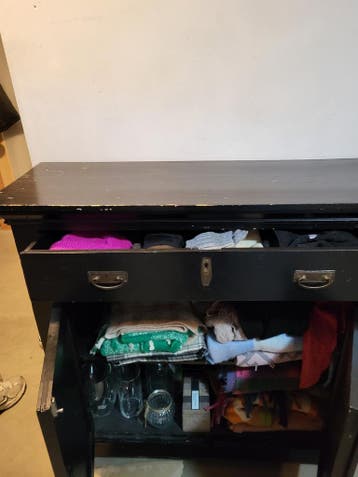 Zwarte kast met 1 lade en twee deurtjes. Opknappertje.