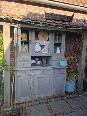 Deze buitenkast is leuk voor onder een overkapping. De kast heeft verschillende lades en deuren. Bovenin zitten ook open vakken. Metalen framen voor de sluitingen los aanwezig. Eraf gehaald ivm verven