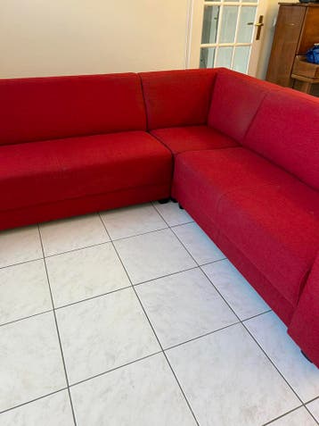 Gratis op te halen. Rode hoekbank korte stuk 210 x lange stuk 240 x zit vlakje 80. De bank is gebruikt en kan nog prima een ronde mee.