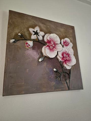 Drie schilderijen, twee met bloemen en één met een roos. De schilderijen met bloemen hebben een 3d-effect. Het roos schilderij heeft ook tekst. Ze zijn gebruikt.