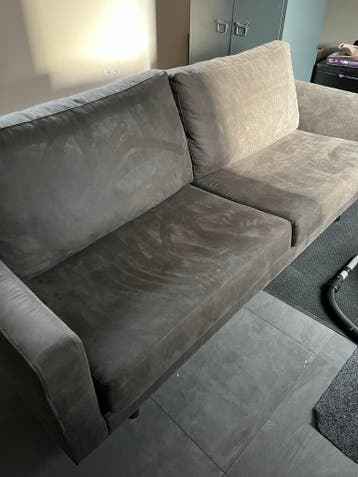 Deze bruin/grijze 3-zitsbank is te koop. De bank heeft een stoffen bekleding en is geschikt voor drie personen. De kleur is een beetje bruin/grijs, afhankelijk van het licht. Wegens verandering van in