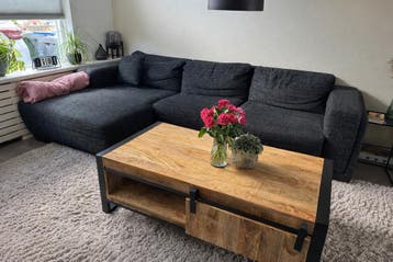 Deze donkergrijze hoekbank heeft een stoffen bekleding en biedt veel zitruimte. De bank heeft een chaise longue aan de linkerkant. Er is wel een kat aanwezig. Hij mag gratis worden opgehaald ergens ha