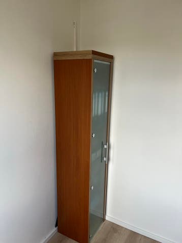 Deze vitrinekast heeft een houten ombouw en een glazen deur. Er zitten planken in om spullen op te zetten. De kast is smal en hoog.
