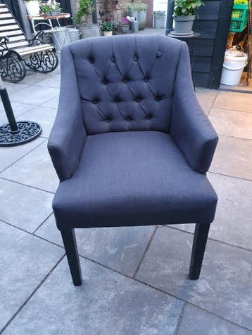 Mooie, comfortabele eetkamerstoel in een elegante antracstof. De stoel heeft een klassiek ontwerp met knoopdetails op de rugleuning en stevige donkere poten. Perfect voor een gezellige eethoek of als
