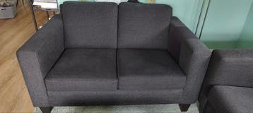 Een gebruikte 2-persoons bankstel en een 2,5-persoons bankstel. Beide banken zijn donkergrijs/antraciet van kleur en hebben stoffen bekleding. De kussens zijn los en om te draaien en de bekleding kan