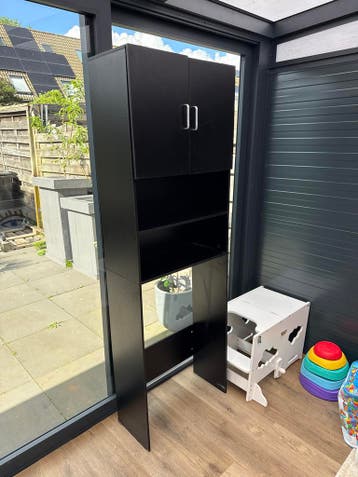 Gratis af te halen: handige ombouwkast voor wasmachine in nette staat. Ideaal om uw wasmachine uit het zicht te plaatsen en extra opbergruimte te creƫren. De kast is zwart van kleur en heeft bovenin e