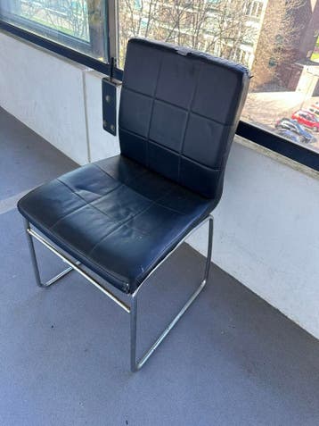 Deze stoel is zwart en heeft een metalen onderstel. De zitting en rugleuning zijn bekleed. Er zijn wat gebruikssporen zichtbaar op de rugleuning.