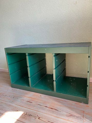 Gratis op te halen: een gebruikte trofast kast, perfect voor het opbergen van speelgoed of andere spullen. De kast is groen van kleur en heeft meerdere vakken. Ideaal voor de kinderkamer of speelhoek.