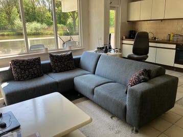 Gratis af te halen: een comfortabele grijsblauwe hoekbank. De bank is in goede staat, maar heeft lichte verkleuringen door zoninval.ophalen capelle schollevaar