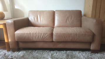 Gebruikt twee-zits bankje van aniline leer. Is wat verkleurd en de kat heeft een hoek beschadigd. Zit wel goed want niet veel gebruikt. 155 Cm breed en 95 cm diep.