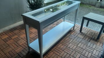 Gratis af te halen smalle kast. Breed 1.32 Cm, diep cm 36 cm, en hoog 76 cm. Kastje is van hout, kleur is wit, en heeft een glazen plaat aan de bovenkant.