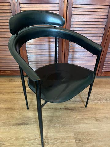 Twee lederen stoelen met metalen onderstel.