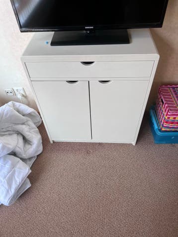 Handig wit kastje met één lade en twee deurtjes, ideaal voor extra opbergruimte in elke kamer. Het kastje is gebruikt, maar nog in goede staat en functioneert perfect. Perfect voor het opbergen van di