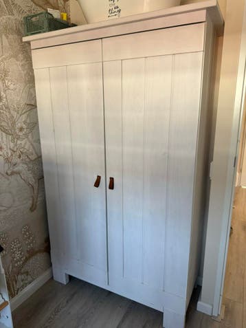 Mooie witte kledingkast voor kinderkamer gratis af te halen. De kast is gebruikt, maar in goede staat en biedt veel opbergruimte met zowel planken als een hanggedeelte. Ideaal voor het organiseren van