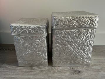 2 opbergdozen. De kleine is 27 cm hoog, breedte/lengte is 18 cm. De grote is 30 cm hoog, breedte/lengte is 23 cm. De grote heeft een kleine beschadiging aan 1 kant door een verhuizing.
