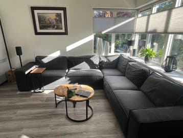 Hoekbank bestaande uit 3 zits met hoekelement en arm links en 2,5 zits arm rechts afmetingen 253x305 cm afmetingen diepte 92 cm(leuningen) 6 losse rugkussens 2 delen let op bank is gebruikt en vertoon