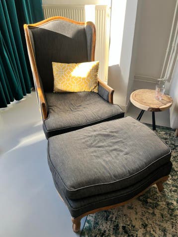 Gratis op te halen: een comfortabele fauteuil van meuble solitaire. De stoel heeft een klassiek houten frame en is bekleed met een donkergrijze stof. Ideaal voor een gezellige leeshoek. Vandaag of mor