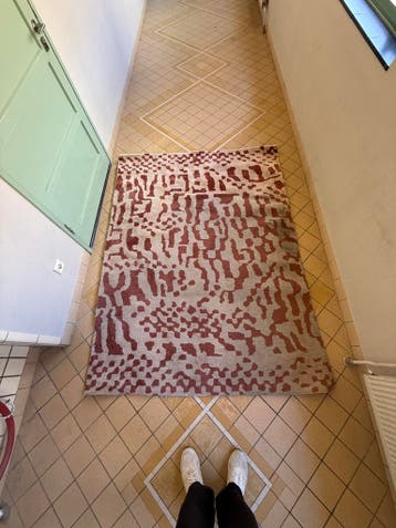 Let op: hij heeft wel vlekken. Dit moderne vloerkleed heeft een uniek abstract patroon in aardetinten, perfect om elke kamer een eigentijdse uitstraling te geven. Het kleed is in goede staat en voelt