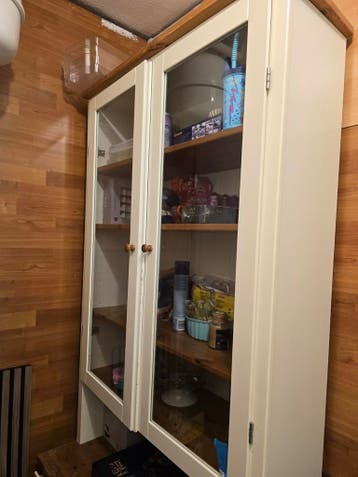 Gratis af te halen: een nette vitrinekast met twee glazen deuren en houten planken. De kast heeft een crèmekleurige afwerking met een houten bovenblad en houten knoppen, wat zorgt voor een landelijke