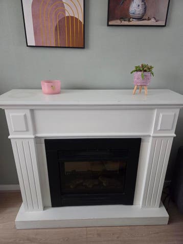 Schouw met elektrische sfeerhaard in gebruikte staat, heeft een nieuw likje verf nodig. Ongeveer: hoog: 101 cm breed: 119cm diep: 40 cm gratis kacheltje heeft 1 lamp kapot. Wordt nog wel lekker warm.