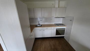 Deze nette hoekkeuken is compleet met boven- en onderkasten, een spoelbak met kraan, een 4-pits gaskookplaat, koelkast en een oven. De keuken is ideaal voor een kleinere ruimte en biedt voldoende opbe