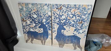 Deze set bestaat uit twee prachtige schilderijen met een uniek ontwerp van herten en natuurlijke elementen. Schade zien 2de photo