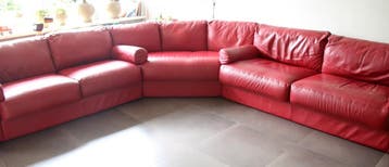 Wegens verhuizing naar een kleinere woning bieden wij onze ruime rode leren hoekbank aan. De bank biedt comfortabel plaats aan 7 personen en is bekleed met leer. Er zijn hier en daar wat slijtplekken,