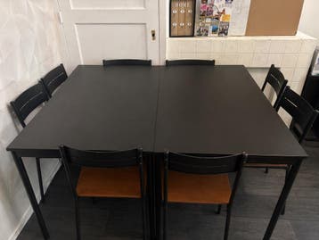 Te koop: nette en stevige eettafel set met 8 stoelen. De set bestaat uit 2 losse tafels die tegen elkaar staan, waardoor je één grote tafel hebt. Ideaal voor grotere gezinnen of als je vaak gasten heb