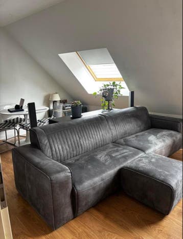 Een moderne, rechte bank met een losse poef, uitgevoerd in een donkergrijze stof. De bank is 290 cm breed en 90 cm diep en 60 cm hoog en heeft een stijlvolle gestikte afwerking op zowel de rugleuning