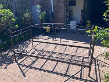 Leuk eenpersoonsbed! Het bed is helemaal compleet en gratis op te halen. Het is gemaakt van metaal en heeft een donkere kleur. Het bed is gebruikt, maar in goede staat.