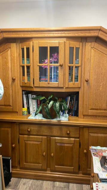 Mooie kast licht eiken met glas lade en schappen in 2 delen maat breedte 184 cm hoogte 205 cm diepte 50 cm