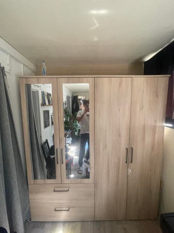 Gratis af te halen kledingkast in goede staat. De kast heeft de afmetingen 179 cm breed, 199 cm hoog en 58 cm diep. Er is een klein stukje lak af onder de deurklink, zoals te zien op de foto's. Vo