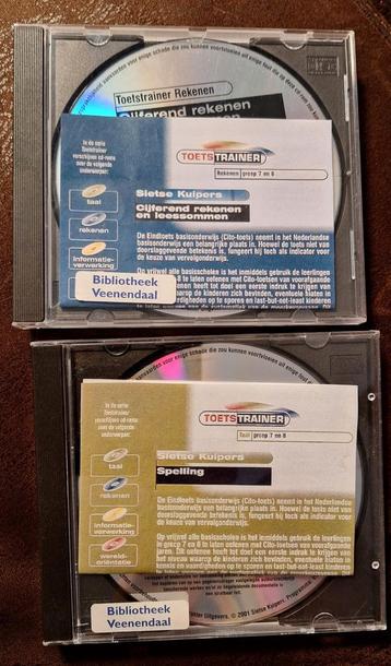 Twee toetstrainer cd-roms voor leerlingen in groep 7 en 8. De ene cd-rom is voor rekenen en leessommen, de andere voor spelling. Beide cd-roms zijn in goede staat en kunnen gebruikt worden om te oefen