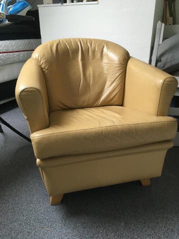 Leren kuipstoeltje, mosterdgeel.