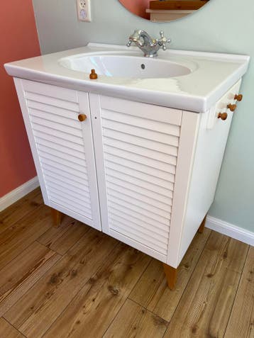 Mooi wastafelmeubel, behalve 1 afgebroken handgreep (nog wel aanwezig) in prima staat. Een nieuwe handgreep zou bij ikea gekocht kunnen worden. De plank halverwege ligt los, dus kan ook verwijderd wor