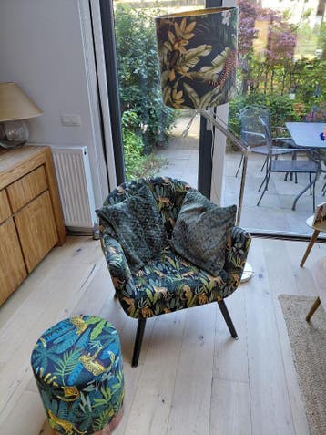 Vanwege nieuwe inrichting mogen deze lamp, stoel en poef weg. Gratis af te halen.