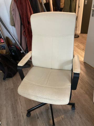 In hoogte verstelbare bureaustoel. Zachte zitting. Heeft gebruikssporen, zoals te zien op de foto's. Gratis op te halen.