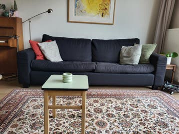 Afmetingen: breed 230cm, diepte hele bank 85cm, diepte zitting 55cm. Vanwege samenwonen bank overbodig. De kussens van het zitvlak kunnen opgevuld worden. De hoezen kunnen afgeritst worden om te wasse