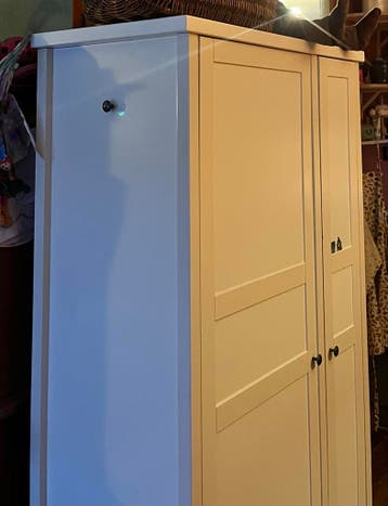 Stevige kledingkast met zowel een hang- als leggedeelte, ideaal voor diverse kledingstukken. De kast is reeds gedemonteerd voor eenvoudig transport. Houd er rekening mee dat er gebruikssporen aanwezig