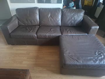 Bruine echt lederen hoekbank met hocker gratis ophalen!! De bank is niet doorgezakt zit nog steeds lekker. Alleen de hocker kussen was één geheel. In 2 delen gemaakt zodat je aan beide kanten de hocke