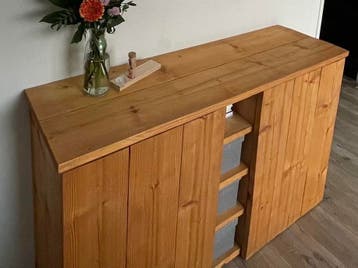 Mooi dressoir gemaakt van steigerhout, licht gelakt. Het dressoir heeft open vakjes in het midden en aan beide zijkanten 2 deuren met daarin 1 plank. Hxbxd in cm : 84x140x39 alleen ophalen.