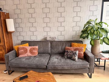 Mooie grijze leren 3-zitsbank, zo snel mogelijk op te halen. De bank is comfortabel en past in diverse interieurstijlen. Ideaal voor wie snel een goede bank nodig heeft. We doen deze weg omdat we een