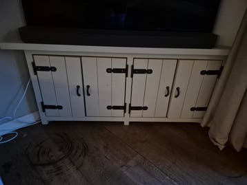 Uniek, op maat gemaakt hoek tv meubel in landelijke stijl. Dit meubel is perfect om een lege hoek in uw woonkamer optimaal te benutten en biedt voldoende opbergruimte voor al uw media-apparatuur. Het