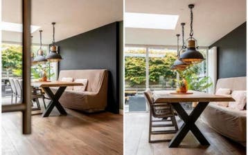 Deze eetbank bestaat nu uit twee delen die aan elkaar vast zitten met een hoes eroverheen. Zit nog prima en kan zeker nog een ronde mee. Handig voor bijvoorbeeld een studentenkamer, zolder of logeerka