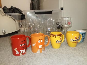 Diverse glazen en mokken gratis af te halen. De collectie omvat verschillende soorten glaswerk, waaronder bierglazen en drinkglazen, evenals een aantal leuke mokken, waaronder m&m's en chocome