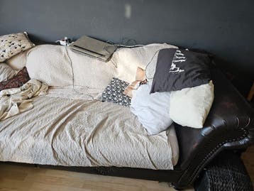 Bank en poef. Binnen maat bant is 200x90. Kussens zijn niet origineel. In plaats van de originele kussens ligt er een normaal matras in en de rug kussens zijn gewone ved kussens zodat de bank ook makk
