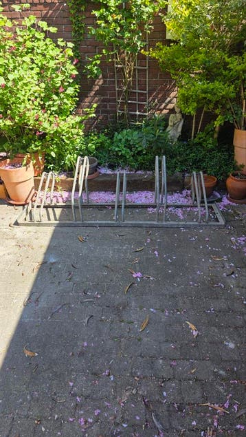 Stevig metalen fietsenrek van 175 cm breed, geschikt voor het stallen van 5 fietsen. Ideaal voor in de tuin, bij een schuur of voor een bedrijfspand. Het rek is gebruikt, maar nog in goede staat en ka